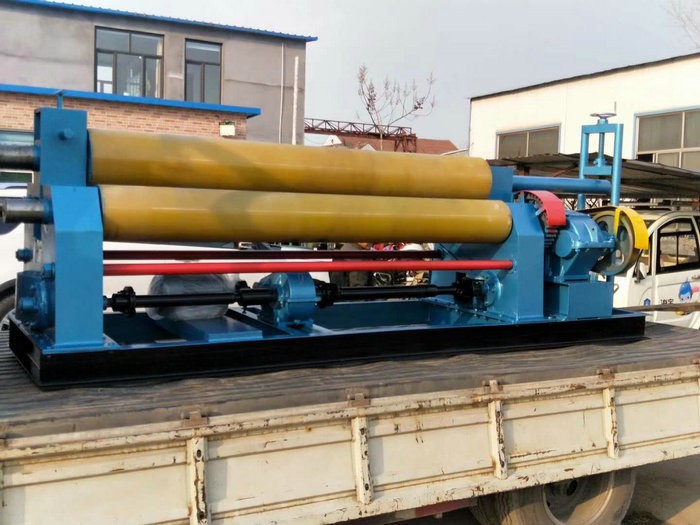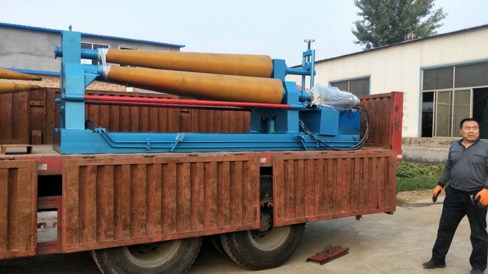 該機結構型式為三輥對稱式,上輥在兩下輥 對稱位置作垂直升降運動,通過絲杆絲母蝸杆傳動而獲得,兩下輥作旋轉運動,通過減速機的輸出齒輪與下輥齒輪齧合,為卷製板材提供扭矩。上輥可分離取料電動升降起輥。可安裝靠輪卷製錐體、角鐵、槽鋼等異異型鋼材。